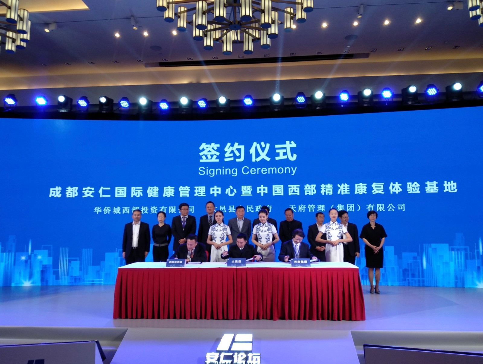 天府集团、中共大邑县人民政府、华侨城集团有限公司各级领导共同出席了本次签约仪式,由天府集团健康医疗事业部总经理李光明先生、华侨城西部投资有限公司总会计师黄志强先生及大邑县人民政府副县长李健康先生作为三方代表,签署了“安仁国际健康管理中心暨中国西部精准康复体验基地”项目的合作框架协议。
